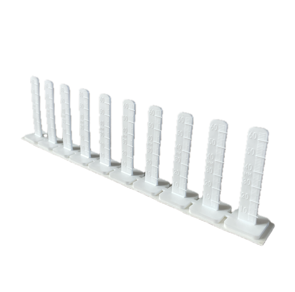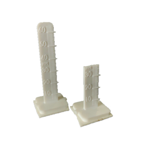 LEVELPEGS® are used to pour self-leveling compounds and mortar to a specific, accurate depth to ensure precise concrete slab floor leveling. The LEVELPEG® design features dual measurement indicator marks in inches and millimeters: One side measures between 6 to 64 millimeters, and the reverse side measures between 3/16 to 2 1/2 inches. When used in conjunction with the NIVCOMP, you simply read the proper height on the NIVCOMP then cut the LEVELPEG® to match.